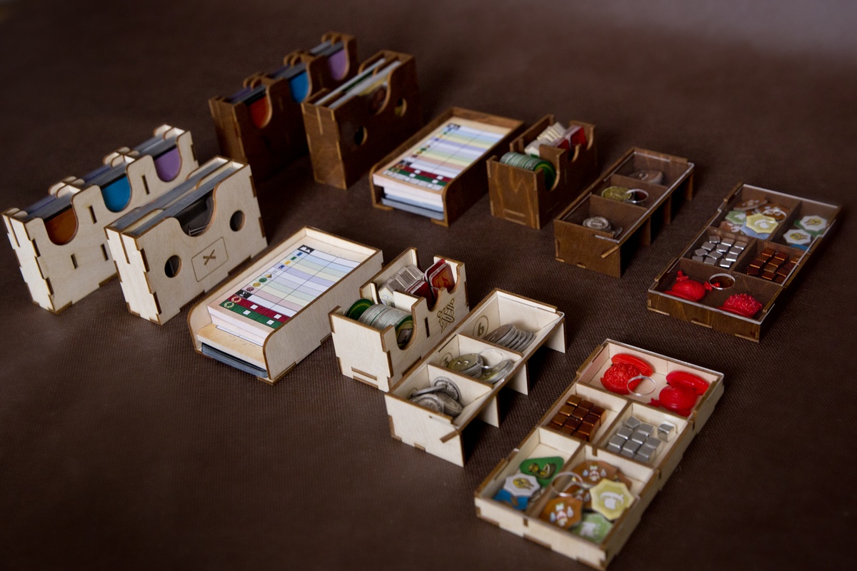 Pojemniki na monety i na elementy z dodatków wraz z pionami konfliktu i Minewry posiadają zasuwki z pleksi. Takie rozwiązanie umożliwia przechowywanie pudełka w pionie i zawartość pojemników nigdy się Wam nie wysypie (bez względu na to czy posiadacie dodatki czy też nie).