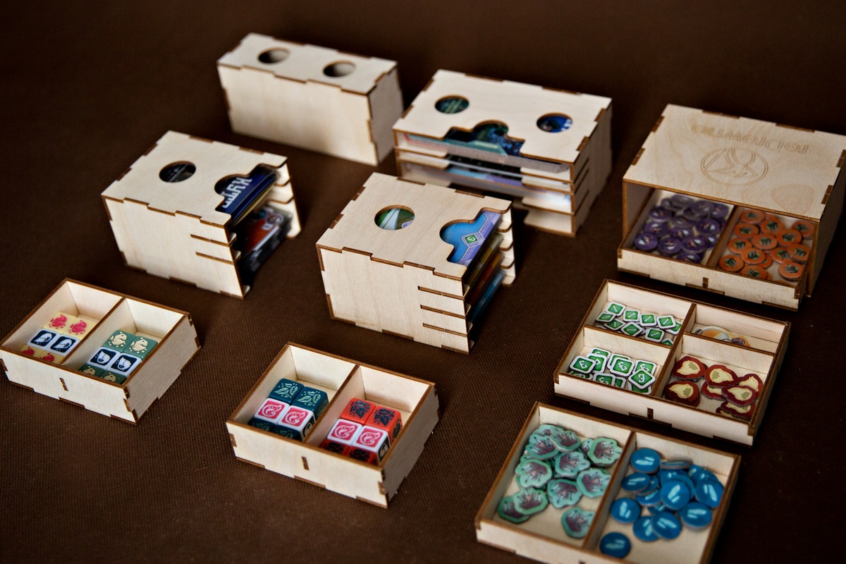 - pojemniki na karty, żetony i znaczniki pomagają utrzymać ład na stole,
