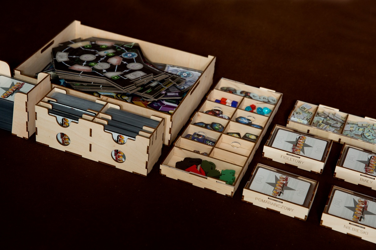 Pudełko wraz z zawartością domyka się bez podniesienia wieka. Insert posiada osobne przegrody na talie kart z dodatków - pozwala to na odseparowanie ich od gry podstawowej. Karty rezerw podzielone są rodzajami. Talia podstawowa (przygód) przechowywana jest w pojemniku, który może pełnić funkcję wydajnego podajnika w trakcie gry. Pojemniki na żetony, kredyty oraz kosteczki z taliami startowymi posiadają zasuwki z pleksi. Takie rozwiązanie umożliwia przechowywanie pudełka w pionie i zawartość pojemników nigdy się Wam nie wysypie.