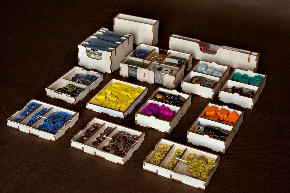 - pojemniki na karty, żetony i znaczniki pomagają utrzymać ład na stole,
