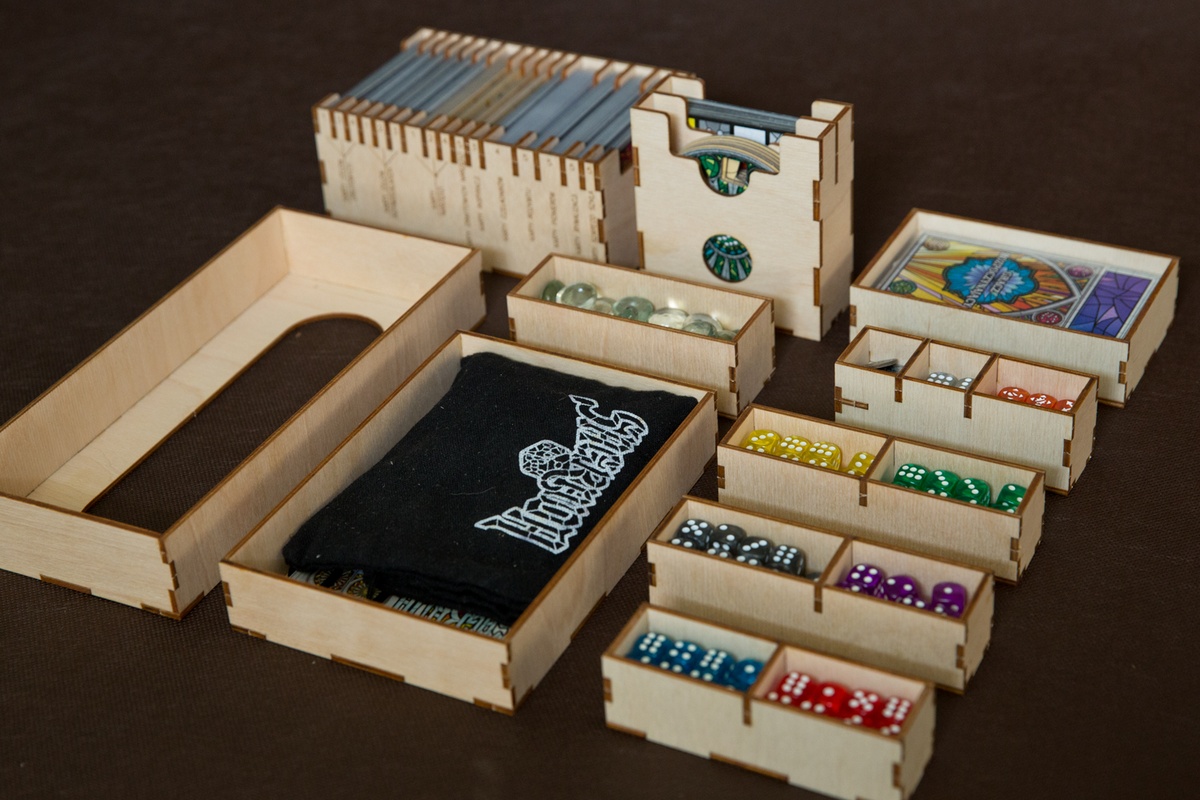 Insert jest tak skonstruowany, że nie ma potrzeby opróżniania worka z wsypanej puli kości zależnej od ilości graczy - ilość kości przechowana w worku od 50 (2 graczy) do 130 kości (6 graczy). Pozostałe kości przy ilości 2-5 graczy są przechowane w pojemnikach (podzielone na kolory). Pojemnik na karty umożliwia podzielenie kart według rodzajów oraz dodatków.