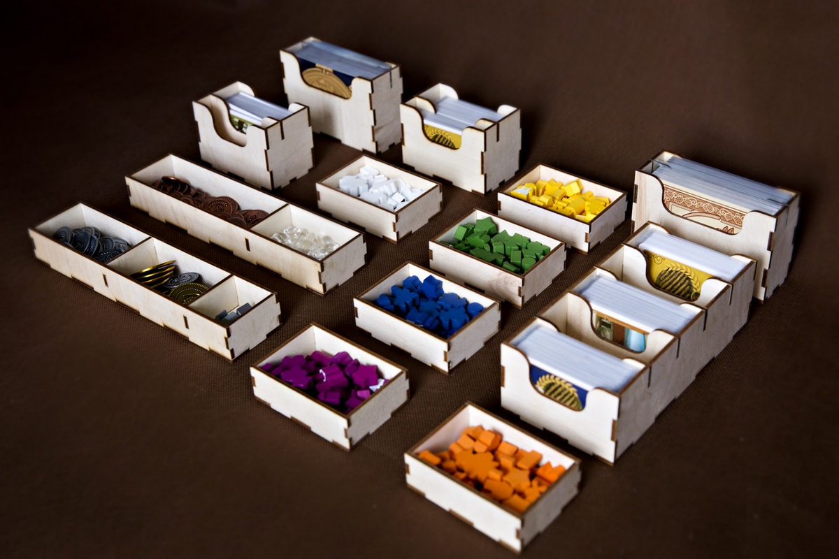 Pionki i przeciwnicy zostały podzielone kolorami, każdy z nich posiada własny pojemnik. Pionki szare, monety oraz znaczniki gron mają swoje miejsce w dwóch pojemnikach jeden z nich jest dwukomorowy, drugi trzykomorowy. Do przechowywania kart mamy 5 pojemników w różnych rozmiarach. Karty mini z gry podstawowej i dodatku Toskania przechowywane są w dużym pojemniku na karty. Karty mini z dodatków Goście z Doliny Renu i Goście z Wrzosowisk przechowywane są w dwóch małych pojemnikach na karty.