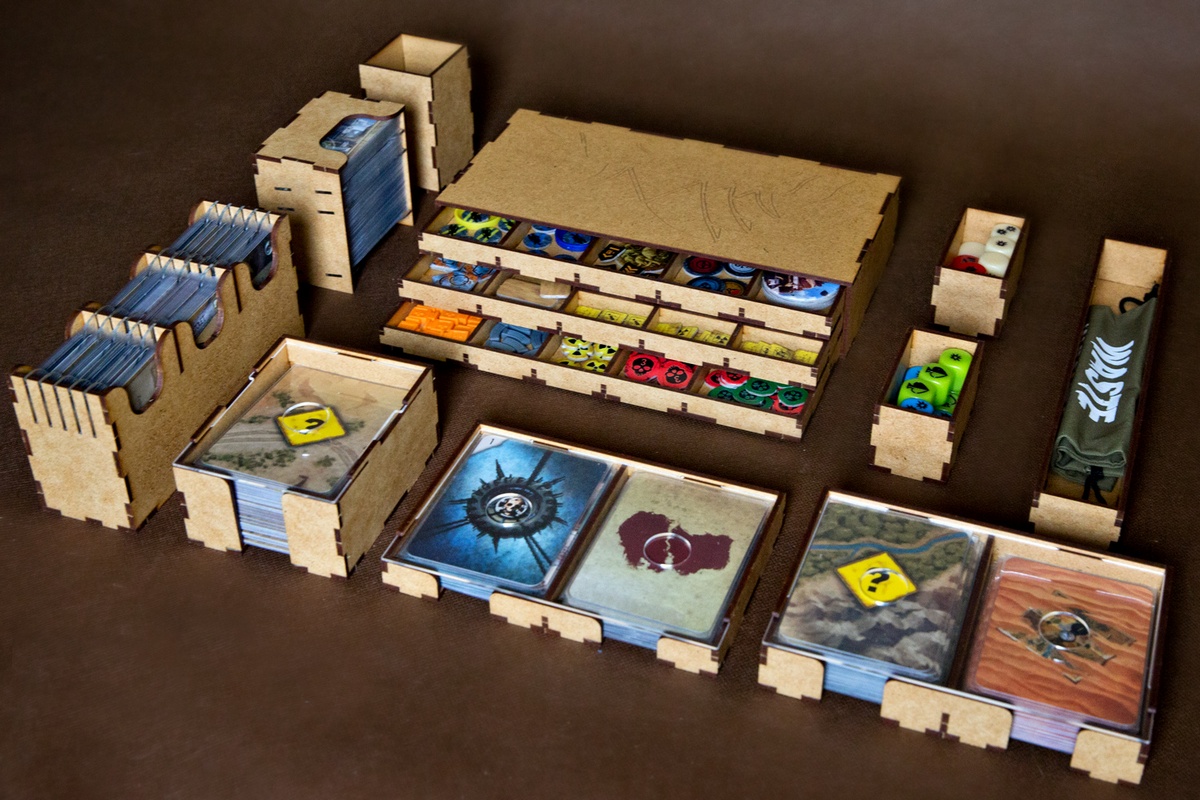 Pojemniki na karty Pustkowi, Eksploracji, Przygód, oraz Legendarnych Miejsc stanowią równocześnie podajnik na karty w trakcie gry. Pojemniki na żetony stanowią również tacki na żetony w trakcie rozgrywki. Takie rozwiązanie pozwala na wygodniejszą rozgrywkę. Pojemnik na karty Sprzętu, Części oraz Zleceń Miejskich stanowi również podajnik na karty, który umożliwia pobieranie na karty ze spodu stosu. Dodatkowo podajnik posiada od tyłu wycięcie, umożliwiające łatwe wypchnięcie kart.