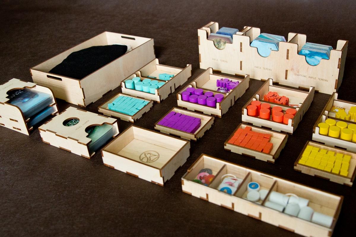 - woreczki z żetonami zasobów oraz znacznikami terenu są przechowywane razem z nimi i nie ma potrzeby jego opróżniania.