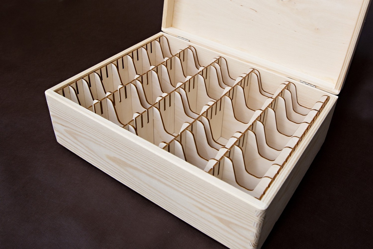 Cena obejmuje gotową skrzynię wraz z insertem do samodzielnego sklejenia. Skrzynia i insert nie są umalowane. Insert wykonany jest ze sklejki o grubości 3mm. Do sklejenia wymagany jest klej WIKOL, który możesz kupić tutaj. Elementy gry widoczne na zdjęciu, służą do zobrazowania ich ułożenia i nie są w zestawie. Produkt może rożnić się kolorystycznie od tego ze zdjęć, ponieważ zależy to od konkretnej partii drewna.