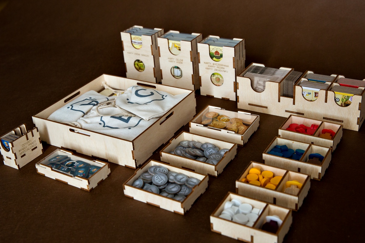 Pojemniki w insercie posiadają grawery ułatwiające posegregowanie elementów. Woreczki przechowywane są razem z żetonami w środku, nie trzeba ich wysypywać. Pojemniki w drobnymi żetonami są zasuwane co pozwala na pionowe przechowywanie pudełka.