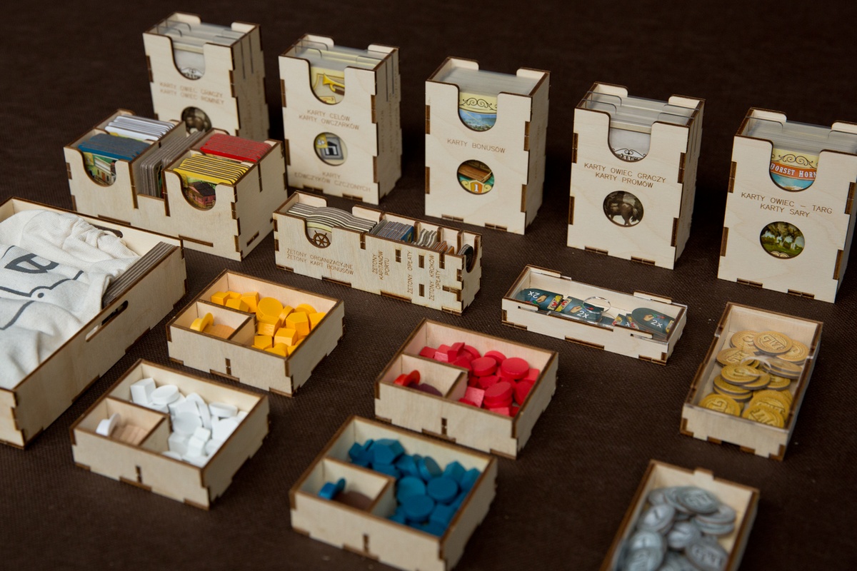 - 4 pojemniki na komponenty Graczy mieszczące: owczarza w kapeluszu, 16 dysków, 10 magazynów, znaczniki złota i certyfikatów, statek,