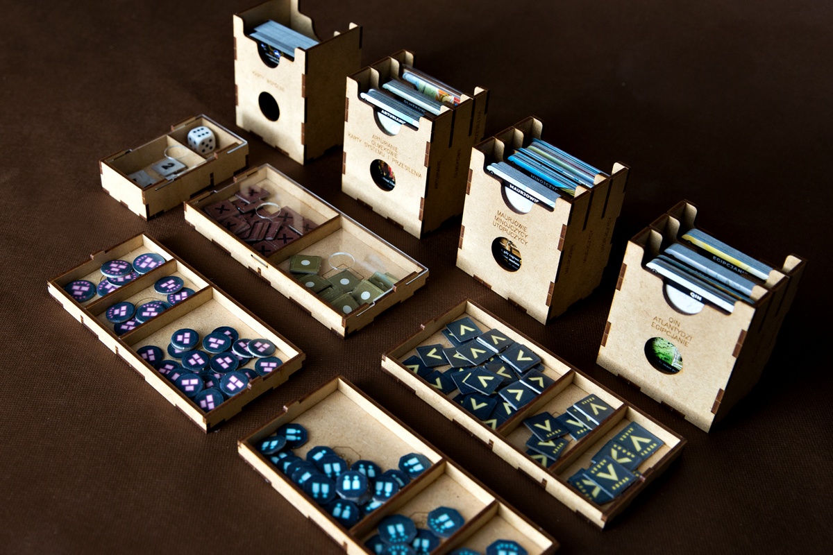 - 4 pojemniki (w tym jeden zasuwany) na żetony zasobów, populacji i postępu umożliwiające podział wg ich wartości,