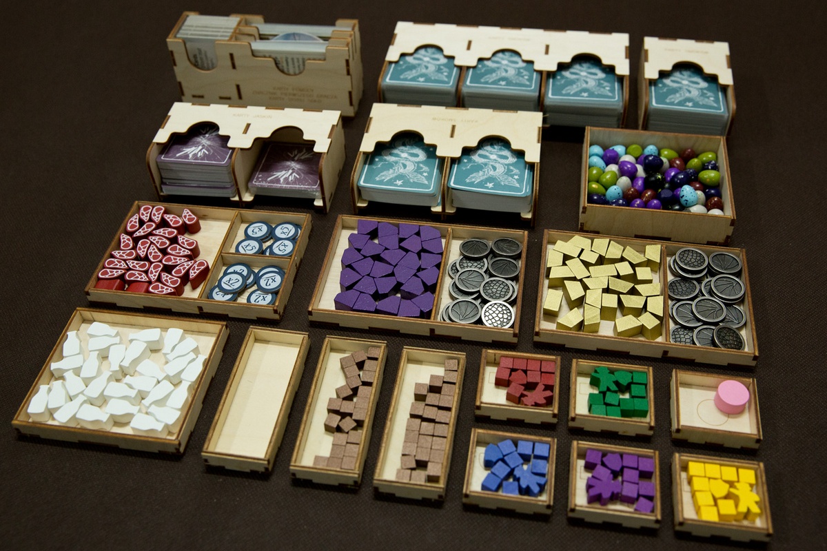 - 3 pojemniki / podajniki na karty smoków oraz jaskiń,