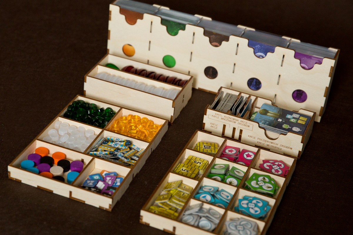 - 1 pojemnik na żetony odkryć, kafle tuneli, drewniane znaczniki oraz znaczniki farm, odsalarni, laboratoriów,