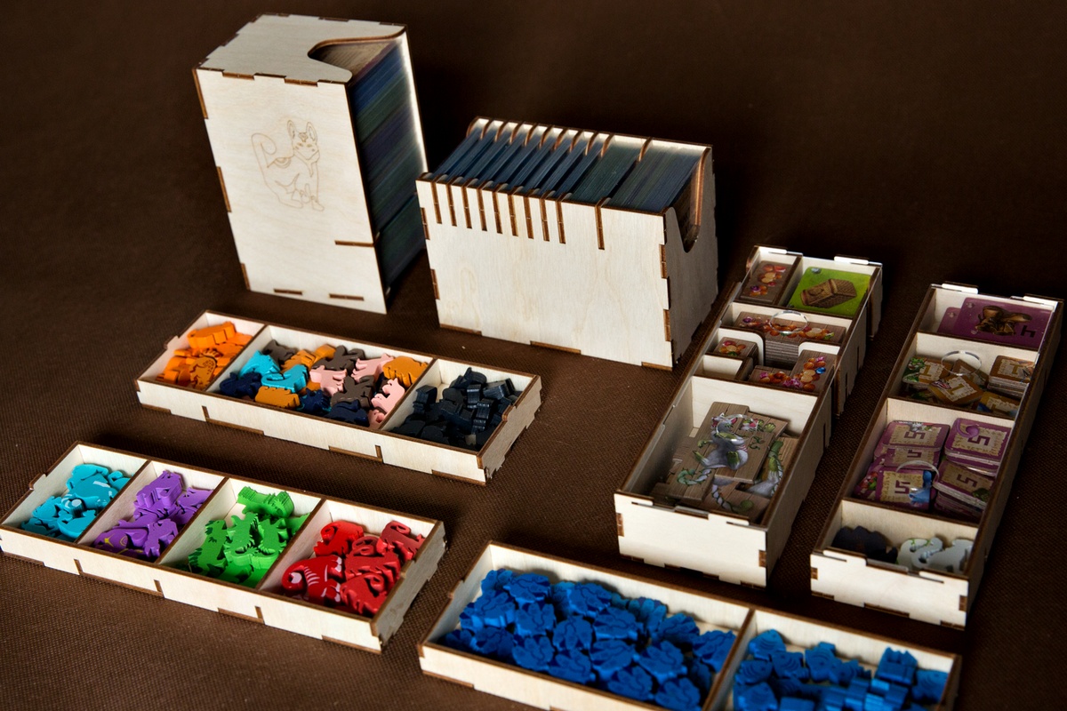 - 3 pojemniki na drewniane figurki kotów, Bestii, Królewskich Szczurów oraz żetony ryb. Pojemniki są układane pod pojemnikiem z zasuwką z pleksi. Te pojemniki posiadają specjalne blokady w celu uniemożliwienia ich przemieszczania się w pudełku,