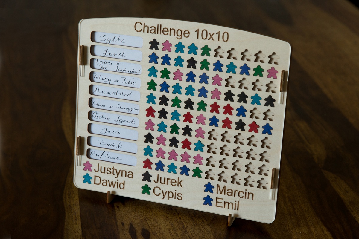 Tablica Challenge 10x10 Personalizowana jest wykonana ze sklejki. Tablice są wykonywane dla różnej ilości graczy (od 2 do 6). Tablica produkowana jest na zamówienie i posiada na stałe wygrawerowane imiona (podane przez Was przy zamówieniu). Tablica posiada wysuwaną wkładkę na której wpisujecie ręcznie (we własnym zakresie) 10 nazw gier, które będziecie rozgrywać. Wkładka jest oklejona dwustronnie, więc można zmienić nazwy na liście gier (można potem nakleić kolejną listę i uzupełnić ponownie). W przygotowane otwory obok imion graczy wkładacie meeple w swoich ulubionych kolorach, żeby oznaczyć swoją osobę. Po rozegranej grze zwycięzca wkłada meepla w określonym rzędzie w swoim kolorze. Po wypełnieniu tablicy (rozegrane 100 partii), będziecie mieli obraz ilości wygranych przez każdego z graczy z kolorowych meepli. Następnie możecie wyjąć meeple (wsypać je), wypełnić listę gier na nowo i rozpocząć zabawę od początku.