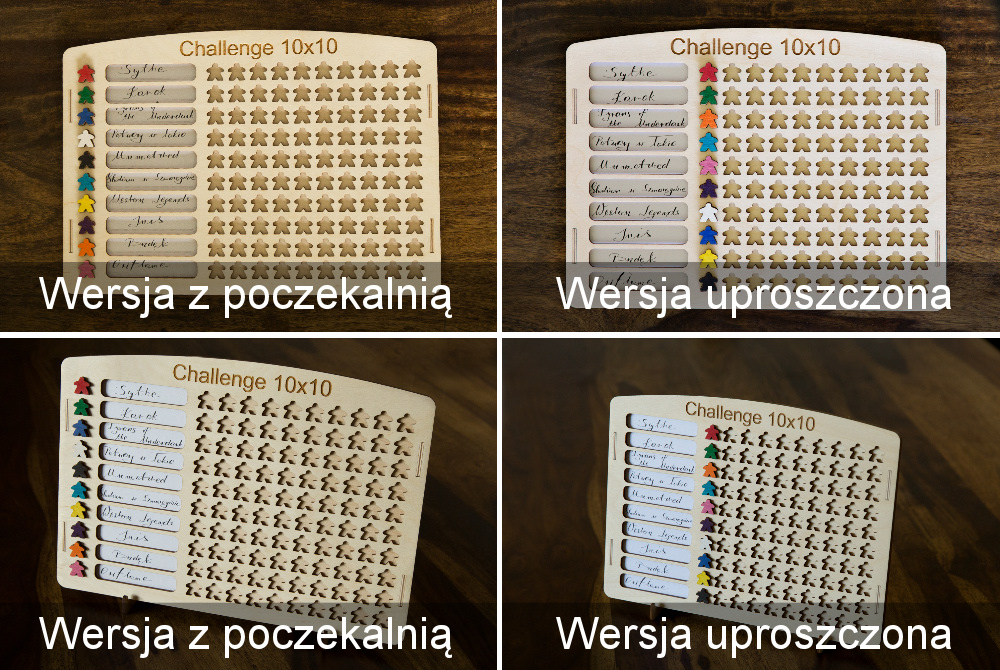 Tablica Challenge 10x10 Standardowa do odliczania rozgrywek jest wykonana ze sklejki. Tablica posiada wysuwaną wkładkę na której wpisujecie ręcznie (we własnym zakresie) 10 nazw gier, które będziecie rozgrywać. Wkładka jest oklejona dwustronnie, więc można zmienić nazwy na liście gier (można potem nakleić kolejną listę i uzupełnić ponownie). Po rozegranej pierwszej danej grze wkładacie meepla w pierwsze pole w określonym rzędzie, a po kolejnych partiach przesuwacie meepla o kolejne pola w prawo. Meeple są grubsze niż otwory, w które są wkładane, więc da się je łatwo wyjmować i wkładać.
