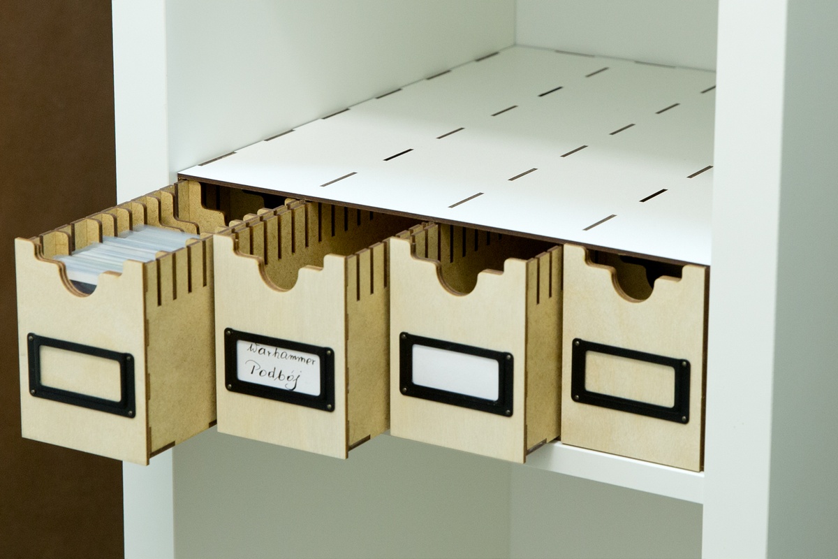 Zasobnik z szufladami na karty pasujący do regału Kallax z IKEA. Zasobnik posiada wysuwane szuflady co pozwala na ich wyjęcie i postawienie na stole do gry celem przygotowania rozgrywki. Wykonanie jest modułowe, co oznacza, że może on funkcjonować jako zestaw dwóch lub trzech poziomów zasobników. Trzy poziomy całkowicie wypełniają wnękę regału. Na pojedynczym lub podwójnym poziomie można układać gry. Poszczególne poziomy łączone są na wyjmowalne "piny" co utrzymuje całość w jednej równej bryle. Na frontach szuflad zamontowane są na stałe okucia w kolorze czarnym umożliwiające włożenie karteczki z opisem zawartości szuflady.